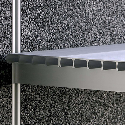 This four-inch extruded aluminum bookshelf can be supported on Rakks Style (BR-004) shelf brackets or used in combination with other shelf sections to make 10”, 14” or 16” deep shelves.