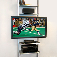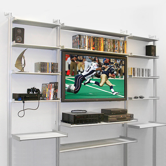The Rakks two and four-pole kits can support either a pedestal flat screen TV or wall mounted flat screen TV using a bolt-on- bracket (shown, not included). Based on the Patented Rakks L-Bracket system, US Patent #7,506,852, these television entertainment systems provide sturdy support for your flat panel TV, along with flexible storage shelving for electronic components, DVDs, Games and CDs.