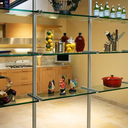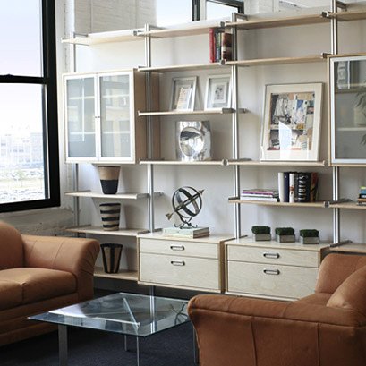 Offering a dramatic new look in pole-mounted shelving, the Rakks L Bracket system, US Patent #7,506,852, provides unparalleled design flexibility, strength and value. Available in floor to ceiling and wall-supported configurations, this new design features quick and infinite shelf adjustment utilizing one hidden screw. L-brackets support wood, glass or aluminum shelves up to 24” deep. Cabinets can be easily attached to the poles to create attractive wall storage units and room partitions. The L-Bracket system is stocked in clear anodized, black anodized and white powder-coat finishes.