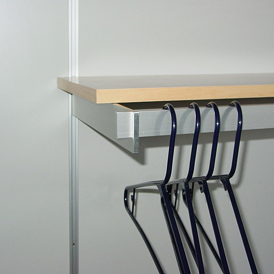 Used to hold 1/4″ x 1-1/4″ hangbar for merchandising clothing or for use in closet applications. Hangbar can also be used as a stiffener for glass or wood shelves to reduce deflection over long spans. Notched brackets can be made to any specified length and notch location.
