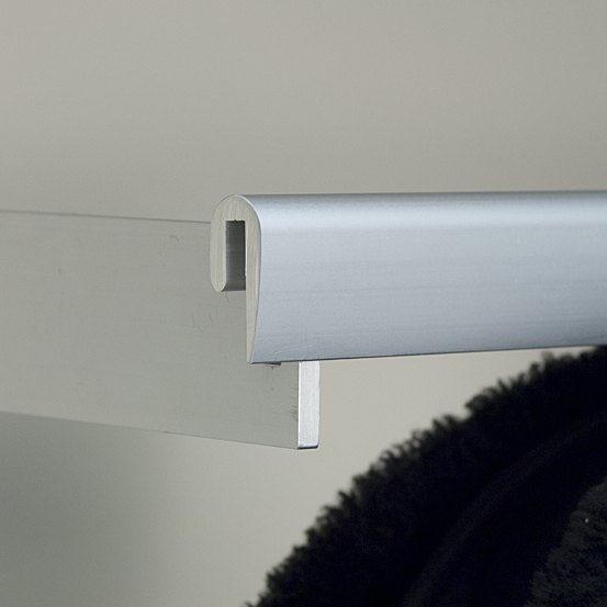 This attractive profile provides extra stiffness for wide spans or heavy clothing. Can be mounted at the end of notched BR2 bracket (shown) or supported on J-Bar Brackets described below.